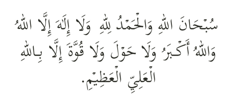 ซุบฮานั้ลลอฮี่ วั้ลฮัมดู้ลิ้ลลาฮี่ ว่าลาอี้ลาฮ่า อิ้ลลั้ลลอฮู่ วั้ลลอฮู่อั๊กบัร ว่าลาเฮาล่า ว่าลากู้ว่าต้าอิ้ลลาบิ้ลลาฮิ้ลอาลียิ้ลอาซีม