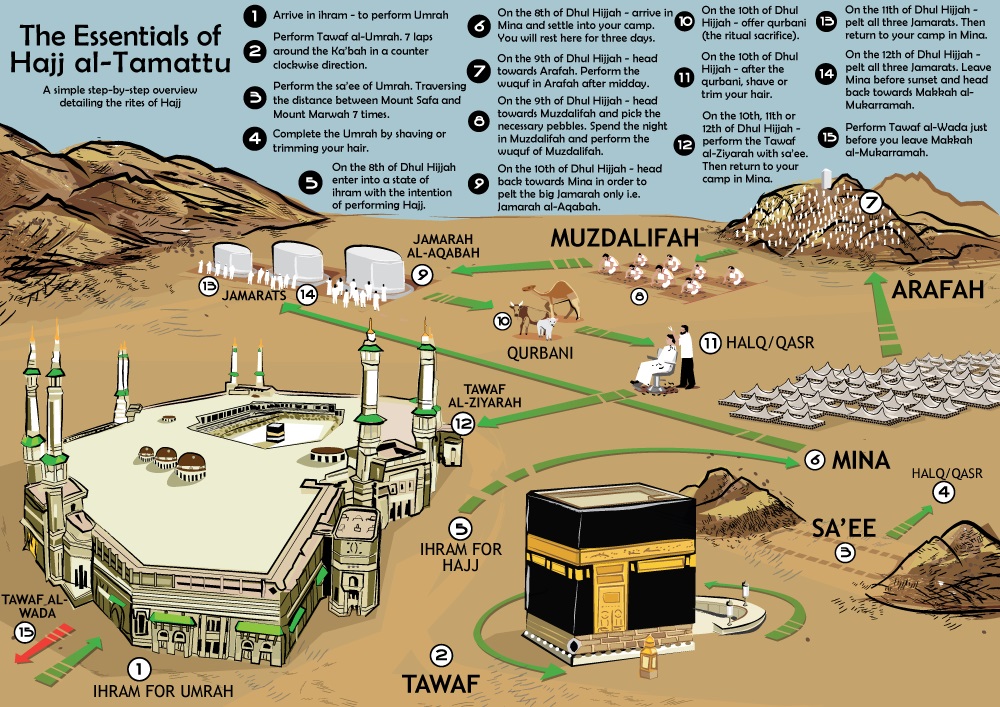 1. เอียะฮ์ราม เริ่มต้นด้วยการอาบน้ำเอียะฮ์รามแล้วจึงละหมาดสุนัตเอียะฮ์ราม 2 ร่อกะอัต หลังจากนั้นให้แต่งชุดเอียะฮ์ราม แล้วจึงเนียตเอียะฮ์ราม อ่าน "ลับบัยกัลลอฮฺมม่า"... 3 จบ จึงเริ่มออกเดินทางเข้ามักกะห์